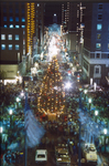 Christmas lights in downtown Fort Worth on Main Street in Sundance Square with decorated tree in center. The Tarrant County Courthouse is seen in the background.