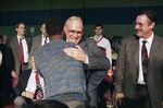 Former House Speaker Jim Wright greets boxer Donald Curry at a Fort Worth boxing match.