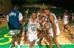 Basketball player Otis Evans (#10) beat Plainview on last-second shot; Dunbar players celebrate victory for Class 5A regional title, March 4, 1990