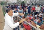 Robert Hughes, head basketball coach at Dunbar High School, accepts good-luck wishes from a crowd of students, parents, and teachers from Maudrie Walton Elementary School before the team's departure to Austin for the state championship tournament.