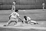 University of Texas at Arlington (UTA) baserunner Bobby Brown, right, slides back to first as Oklahoma Baptist's Karis Reaves applies a late tag. Published in Fort Worth Star-Telegram morning edition March 23, 1990.