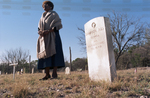 Image shows Miss Charles Wilson standing at her grandfathers grave, Sampson July, in Brackettville's Seminole Indian Scout Cemetery. She is a retired teacher whose lineage is Black Seminole and whose ancestors were scouts. Black Seminoles Indigenous Scouts, were part of a fierce and crafty group of United States warriors who were an essential part of taming the west. This is part of a project to tell and bring forth an unnoted history of Black Seminole Indigenous contribution to United States conquest of the West. Published in Fort Worth Star-Telegram Sunday edition March 25, 1990.