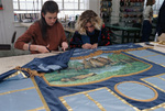 Students of the costume and design department at Texas Christian University work on quilt for the NAMES Project Memorial commemorating those who have died of AIDS. Lori Van Zandt (left) and Gretchen Pahany are seen here working on the quilt with a quotation from Shakespeare's Hamlet, "There's rosemary, that's for remembrance. Pray. Love. Remember." The 6-foot square quilt will be added to the national memorial quilt, set to be dedicated at the U.S. Institute for Theatre Technology conference on April 14, 1990 and will then be exhibited in various cities around the country. The quilt is fashioned after the dropped-down stage curtains used in vaudeville theater and will carry the names of members of the theater institute who have died from AIDS. The students are seated at a table with a quilt laid in front of them. They are working on the quilt with one of them holding scissors. They are other people standing at a distance in the background beside racks with threads and tables with sewing machines.