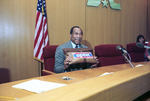 Elzie Odom waiting on election returns for a city council election in Arlington, Texas. Odom won the election by 16 votes to become the first African American city councilman in Arlington.