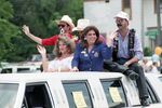 Members of The Court Systems of Texas are seen in a limousine, waving to parade attendees during the Gay Pride Week parade held in Fort Worth. There are two papers affixed to the windows of the car that read "Fort Worth/Arlington Court" and "Dallas Court."