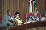 Rev. Howard Caver, pastor of Worldwide Missionary Baptist Church and panelist speaks during a Juneteenth ceremony held at Fort Worth City Hall. Viola Pitts is seen listening to Caver at right. Panelists were posed with the question, "Why should we celebrate Juneteenth?"