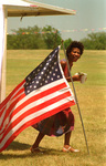 Hillside Park on Juneteenth Celebration: Dede Clayton runs past American flag, 06/20/1990.