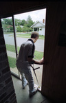 At HEADS UP House in Fort Worth's Fairmount neighborhood, which provides rehabilitation for adult males who have experienced head injuries. A resident leaves through the front door, he can be seen using crutches.