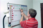 At HEADS UP House in Fort Worth's Fairmount neighborhood, which provides rehabilitation for adult males with head injuries, Elton Shires signs out for dinner date with former business partner. Mr. Shires, can be seen holding his right hand with his left hand while writing on the board.