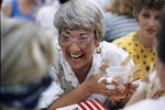 At seminar on special-education transportation for bus drivers and monitors from Grapevine-Colleyville , Crowley, Mid-Cities, and Mansfield schools, Gypsey Megee tries to function with splints on her hands to simulate disability, 08/19/1990. Gypsey has wood sticks attached to her fingers and she is holding a plastic cup of a brown beverage. She has a wide smile on her face and wearing huge glasses.