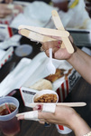 At seminar on special-education transportation for bus drivers and monitors from Grapevine-Colleyville , Crowley, Mid-Cities, and Mansfield schools, participants try to function with splints on their hands to simulate disability, 08/19/1990. The image shows two hands with splints attached to it one had is holding a plastic fork and the other,a cup of brown beans. On the background there is a box of Kentucky Fried Chicken.