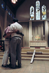 Members share a poignant moment at service consecrating AIDS Awareness Week at Fort Worth's Saint Stephen Presbyterian Church, sponsored by AIDS Interfaith Network of North Texas, 08/23/1990. Three people are seen to be hugging one another in a circle in the church in front of the altar steps with a cross on the steps. There is a table at the altar with lit candles on a candlestick with a flower bouquet at the center.