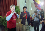 CBS Evening News anchor Dan Rather receives a t-shirt as a gift from Maudrie M. Walton Elementary School students. Rather was invited to the school as part of KDFW's "Great Expectations for Texas" campaign, a two-year spotlight on education.
