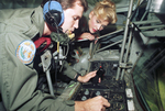 Miss Texas, Suzanne Lawrence, gets some tips on refueling Air Force jets from Airman Phillip Dalrymple, a boom operator on a KC-135, during a tour of Carswell Air Force Base.