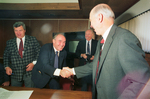 Representatives from the Soviet Union's Ukrainian republic and The University of Texas at Arlington made history when they signed an agreement to begin an educational exchange program. Shown is UTA President Wendell Nedderman, right, shaking hands with Ukrainian official Volodimir Parkhomenko as UTA's Dr. Charles McDowell watches. The man on the far left is unidentified. Published in Fort Worth Star-Telegram morning edition October 23, 1990.