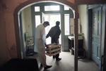 David Chavez, right, and Ramiro Jaime Jr. are seen carrying a crate of records out of the KNON Community Radio station, located at 4415 San Jacinto Street in Dallas. Many DJs at the studio bring their own personal record collections, which they take with them when they leave for the day.