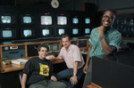 Image shows Executive producers, Barton Weiss, left and Chuck Pratt, center, seated in the control room of "UTA Speaks" with the show's host, Emilio Howell, right. Howell is hosting and producing a new talk show called "UTA Speaks," which originated from the campus of The University of Texas at Arlington. The show is a solution to a problem faced on campus bound dorm dwelling public relations junior. Howell wanted to land a professional internship that translated textbook skills into tangible TV. Published in Fort Worth Star-Telegram morning edition November 2, 1990.