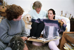 Natasha Noble (right), diagnosed with AIDS three years ago, receives support from Arlington's AIDS Care volunteers, Linda Leithner (left) and Charlotte Heath, 11/11/1990. There are three dogs in the image. Natasha has a book of photographs on her legs.