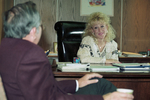 Image shows Ellen Wildemann, right, a history major, seated in president of The University of Texas at Arlington's chair. She has switch with the president in the annual Big Switch, an annual university event in which the president and a student swap places for the morning. On left is unidentified person seated. Published in Fort Worth Star-Telegram evening edition November 15, 1990.