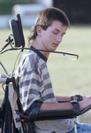 Todd Whitehead, learns to adjust to his wheelchair which he controls by puffing and sipping on a straw. Mr. Whitehead can be seen sitting in his electric wheelchair, he is wearing a striped shirt.