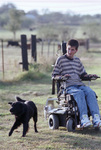 Todd Whitehead, enjoys an outing with his dog Crow while controlling his wheelchair by puffing and sipping on a straw. Mr. Whitehead can be seen in the middle of the field, there are some cows in the background.