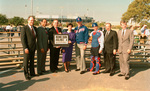 Arlington Mayor Richard Greene, seen wearing catcher's gear (third from right), with Arlington City Council members and Nolan Ryan, fourth from right, begin campaign to finance new Texas Rangers stadium. Elzie Odom is at second from left and Tom Vandergriff is at second from right.
