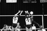 Image shows a volleyball game between UTA and Utah State. Right, Valerie Whitfield (7) spikes volleyball against Utah State's Traci Campbell (4) center. On left is unidentified Utah State volleyball player (7). Published in Fort Worth Star-Telegram morning edition November 24, 1990.