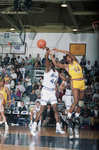 Image shows a basketball game between UTA and Huston-Tillotson. Left is UTA's Sheldon O' Neal, tipping a rebound away from Larry Whiteside, right. Published in Fort Worth Star-Telegram morning edition November 30, 1990.
