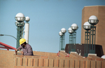 Image shows Daniel Garcia, left, of Ebey Construction Company, using an acid wash to clean masonry on a new bridge over Cooper Street at The University of Texas at Arlington. Published in Fort Worth Star-Telegram morning edition November 30, 1990.