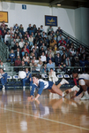 Image shows a volleyball game between UTA and Texas Tech. Center is UTA's April Lee, diving for volleyball in UTA loss to Texas Tech. Published in Fort Worth Star-Telegram evening morning December 1, 1990.