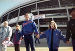 George W. Bush holding the hands of his daughters, Jenna at left and Barbara at right, during the "Hands Around Arlington Day" to promote a proposal for constructing a new baseball stadium for the Texas Rangers.
