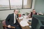 Image shows Robert Wilbers, left, former engineer for GD in Tulsa, Oklahoma is talking with UTA graduate adviser Sherman Reed. A handful of engineers laid off from their jobs at General Dynamics in Fort Worth. They are enrolling in college classes at UTA. Published in Fort Worth Star-Telegram morning edition January 12, 1991.