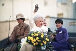 Inauguration of Texas Governor Ann Richards in Austin, Texas. Richards is seen in a horse-drawn carriage, carrying a bouquet of yellow roses and gesturing with up a "Hook 'Em" Texas Longhorns sign with her right hand. Richards' youngest daughter, Ellen Richards, is seen seated behind her in a purple coat.