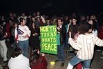 Peace Rally at the University of North Texas. Mike Alves of Austin is seen holding a sign that reads "North Texas Wants Peace" in protest of the possibility of war in the Persian Gulf.