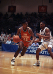 Image shows a basketball game between UTA and Sam Houston State. Left, Joel Donalson (32), Sam Houston, drives with basketball past, right, UTA's Willie Brand (22) during basketball game. Sam Houston won, 82-78. Published in Fort Worth Star-Telegram morning edition February 8, 1991.