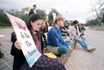 University of North Texas students hold a rally on campus in protest of the Persian Gulf War. A sign held by a student in the foreground reads "War Is Not The Answer."