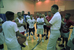 Coach Robert Hughes, Sr., talks with his varsity basketball team at Dunbar High School, Fort Worth.