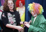 Good Time Players, a performing troupe for people with intellectual disabilities, stage a performance of "Clowning Around" at Dunn Elementary School in Arlington. Instructor Liz LaRochelle hands microphone to Erin Hendrix (right), who is wearing a green striped suit and a multicolored clown wig.