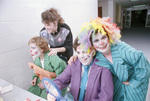Good Time Players, a performing troupe for people with intellectual disabilities, stage "Clowning Around" at Dunn Elementary in Arlington; Traci Russell (upper left) watches Erin Hendrix, Cathy Castano and Jennie Gibson prepare. Miss Russell has her hands in Hendrix's shoulders, both are smiling. Cathy and Jennie are both smiling and looking at the camera.
