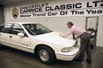 Al Poppitt, autographs a Chevrolet Caprice Classic at the General Motors plant in Arlington that is adorned with hundreds of signatures after being named the 1991 Motor Trend Car of the Year.