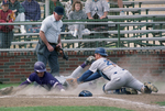 Image shows a baseball game between UTA and TCU. Brad Firestone, left, TCU, slides into home base to beat tag of Todd Toomer, right, UTA. UTA won, 4-3. Published in Fort Worth Star-Telegram evening edition April 3, 1991.