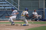 Image shows a baseball game between UTA and Texas Wesleyan. Left, Tim Krejci, UTA, scores before Peter Padia, center, Texas Wesleyan, gets the ball and make a tag during baseball game. UTA won, 12-9. Published in Fort Worth Star-Telegram evening edition April 11, 1991.