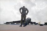 Senior Airman Carlos Nelson pauses at Carswell Air Force Base during maintenance work on a B-52H. Defense Secretary Dick Cheney recommended the closing of Carswell but a final decision on the base's fate is not expected until late summer. The shutdown of Carswell and other Texas bases would be a part of a plan, the Base Realignment and Closure (BRAC) Commission of 1991, to close 31 major domestic military bases and 12 minor installations as well as the realignment of 28 others.