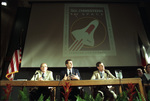 Dallas cardiologist from UT Southwestern Medical School, Drew Gaffney, will conduct experiments for NASA on the space shuttle Columbia; other men not identified, 05/03/1991. Three men are seated at the speakers' table presenting with a projected image on the screen behind them which has a space shuttle in the image and the words "Southwestern in Space" written in their presentation. There is a partial view of people seated to the side.