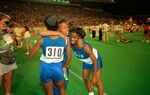 Dunbar girls' track team competing for Class 5A state track title - 3 girls celebrating, May 12, 1991