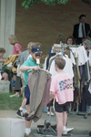 Image shows stage crew members standing beside and handing out wardrobes to extras during the filming of the movie "JFK". Two unidentified crew members are shown looking at costumes from portable wardrobes. The set is a closed, and the film is directed by Oliver Stone. They are setting up a set that includes the appearance of Kevin Costner. Published in Fort Worth Star-Telegram morning edition May 15, 1991.