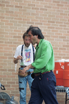 Image shows film director, Oliver Stone, in green shirt, grabbing a snack from the catering table and strolling through the back door of The University of Texas at Arlington Fine Arts Building. Stone is in town for a day to shoot a scene on campus for his upcoming film about the Kennedy Assassination. Behind Stone is a unidentified crew member. Published in Fort Worth Star-Telegram morning edition May 15, 1991.