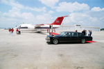 A car carrying Queen Elizabeth II, with an airplane in the background, at Love Field Airport in Dallas. Two local boy scouts are seen at the stairs to the plane, one is holding an American flag while the other is holding a British flag. Dallas Mayor Annette Strauss is see in the white blazer and purple skirt at right.