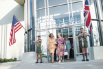 Queen Elizabeth II and Dallas Mayor Annette Strauss walk out of the Dallas Garden Center during the Queen's visit to Dallas. Newly elected Fort Worth Mayor Kay Granger seen just behind them in a blue dress suit. Two local boy scouts are seen at the sides of the open doors, one is holding an American flag while the other is holding a British flag.
