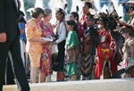 Queen Elizabeth II, alongside Dallas Mayor Annette Strauss, smiles at a group of people dressed in traditional Native American clothing, representing the Texas American Heritage Society, after accepting a gift from the group outside of the Hall of State in downtown Dallas.